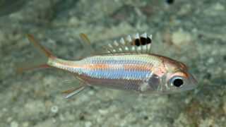 ウケグチイットウダイ 学名 Neoniphon sammara キンメダイ目 / イットウダイ科 / ウケグチイットウダイ属ナイトカラー幼魚;撮影 2008年10月:パラオ セントカーディナル 水深-7m 大きさ約30mm英名 Sammar...