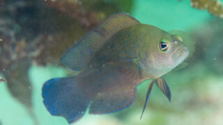 セダカニセメギス 学名 Pseudochromis fuscus スズキ目 / メギス科 / ニセスズメ属撮影 2013年1月:フィリピン マクタン島 水深-5m 大きさ約50mm 英名 Brown dottyback、Dusky dott...