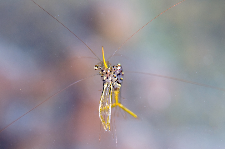 体地色は透明色にて濃紫色や鮮黄色の斑点が散在し、額角や歩脚、腹部の