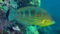 体地色は鮮黄色にて頭部に黒色の斜帯が入り、体側面に水色の