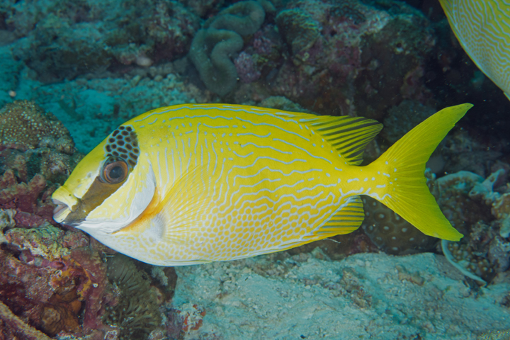 体地色は鮮黄色にて頭部に黒色の斜帯が入り、体側面に水色の
