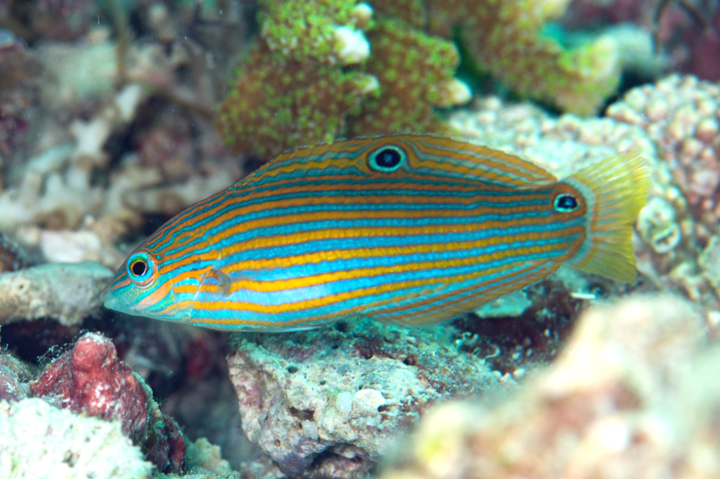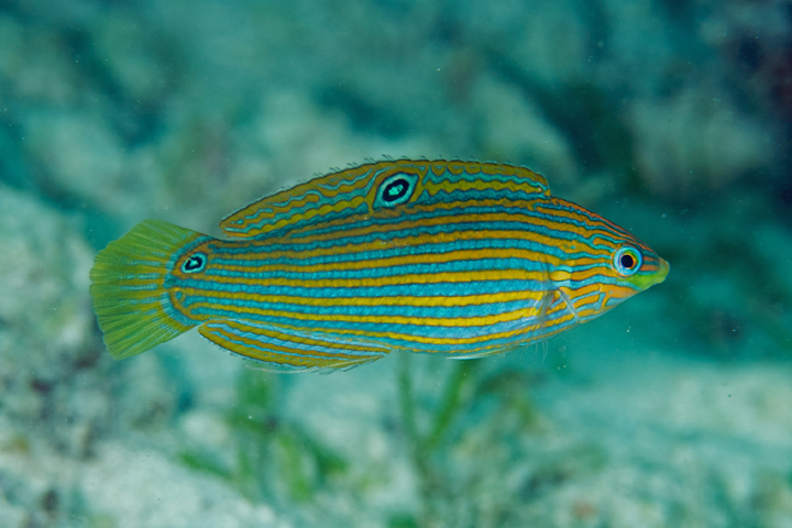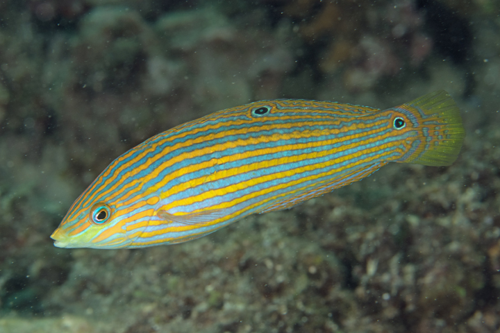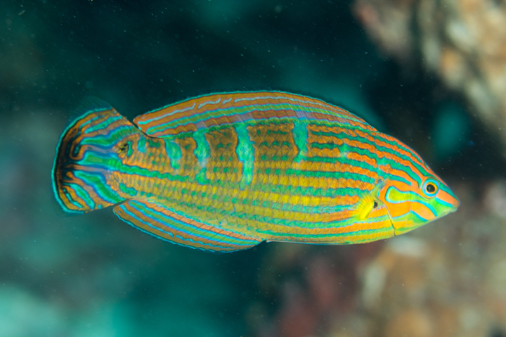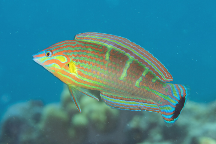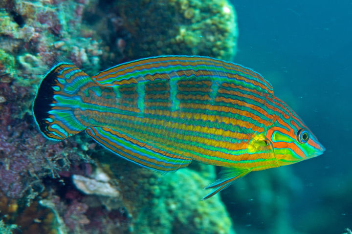 雌の体地色は青黄緑色にて体側面に橙色の縦帯が複数本入り、背鰭の