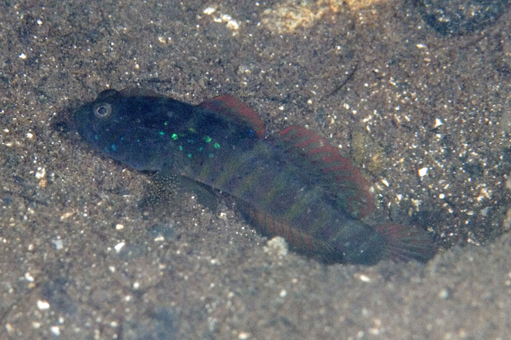 体地色は茶褐色にて体側面に黒褐色の太い横帯が入り、頭部から第1背鰭の