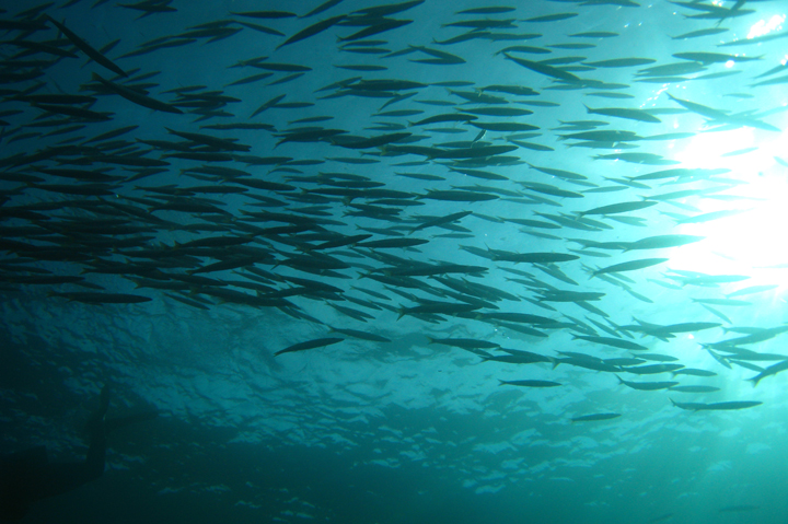 珊瑚礁域を除く沿岸の浅い水深にて、数十~数百匹の群れを成して
