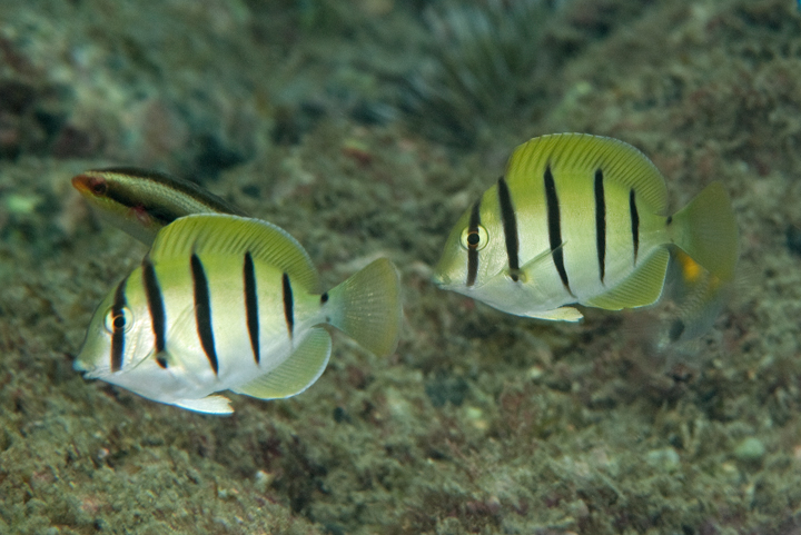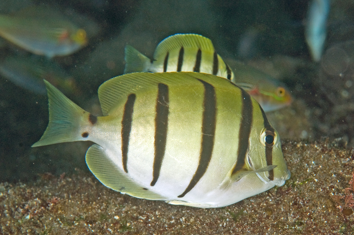 体地色は黄色みがかった銀白色にて、体側面に 5~6本の黒色の横帯が