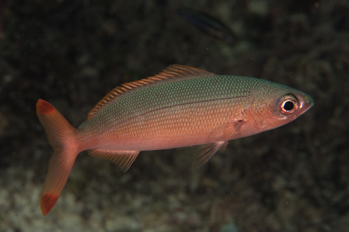 目立つ模様は無く、尾鰭の上下葉の先端に暗色の斑紋が入りますが、